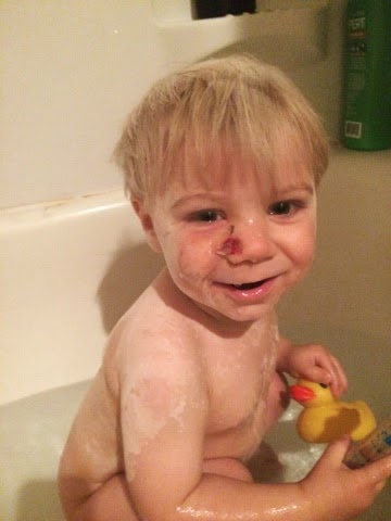 My heart sank when I saw him and his little face was covered in blood. I told our friend we were headed to the emergency room after taking one look at the horrible gash in his nose. I didn't even see his mouth yet. Jason ran up front and we hopped in the car to the nearest hospital.